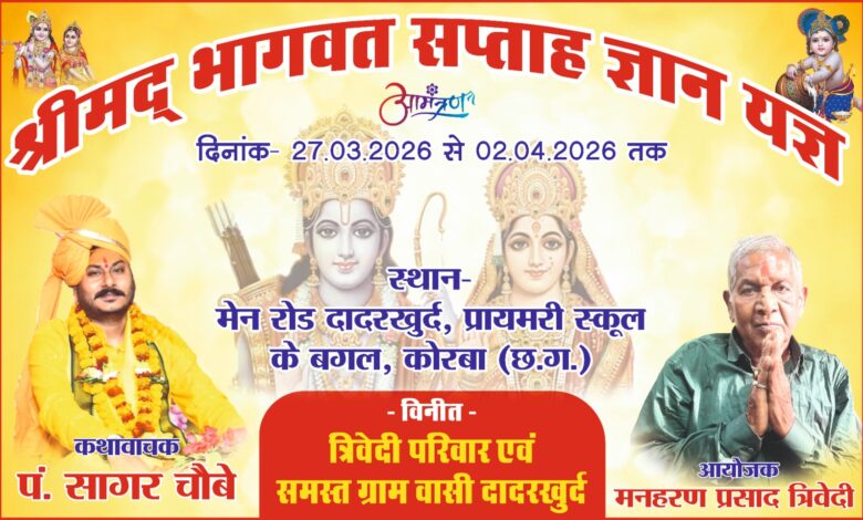 कोरबा की धरा पर बहेगी भक्ति की रसधार: श्रीमद् भागवत सप्ताह ज्ञान यज्ञ का भव्य आयोजन ग्राम दादरखुर्द में 27 मार्च से उमड़ेगा श्रद्धा का सैलाब, सुप्रसिद्ध कथावाचक सागर चौबे करेंगे कथा का अमृत वर्षा