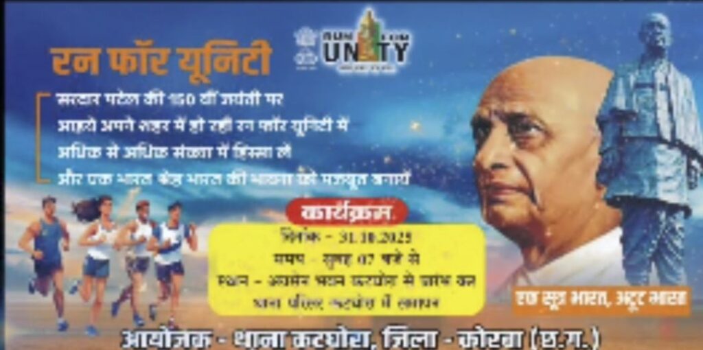 कोरबा। देश के लौहपुरुष सरदार वल्लभभाई पटेल की 150वीं जयंती के अवसर पर 31 अक्टूबर को पूरे देश में ‘रन फॉर यूनिटी’ का आयोजन किया जा रहा है। प्रधानमंत्री नरेंद्र मोदी ने इस अवसर पर देशवासियों से आह्वान किया है कि वे राष्ट्रीय एकता दिवस पर आयोजित इस कार्यक्रम में बढ़-चढ़कर भाग लेकर एकता, अखंडता तथा भाईचारे का संदेश दें।