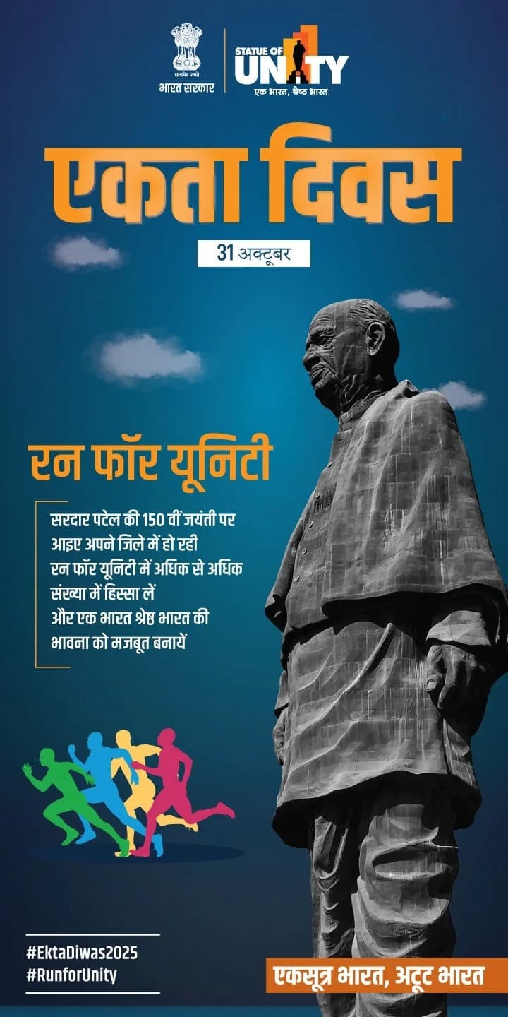 उन्होंने कहा “आइए, हम सब मिलकर सरदार पटेल के अखंड भारत के सपने को साकार करने की दिशा में एकजुटता की भावना का प्रदर्शन करें और राष्ट्रीय एकता दिवस को गौरवपूर्ण बनाएं।” राष्ट्रीय एकता दिवस का यह आयोजन न केवल सरदार पटेल के प्रति श्रद्धांजलि है, बल्कि यह देश की विविधता में एकता के संदेश को और मजबूत करने का माध्यम भी बनेगा।