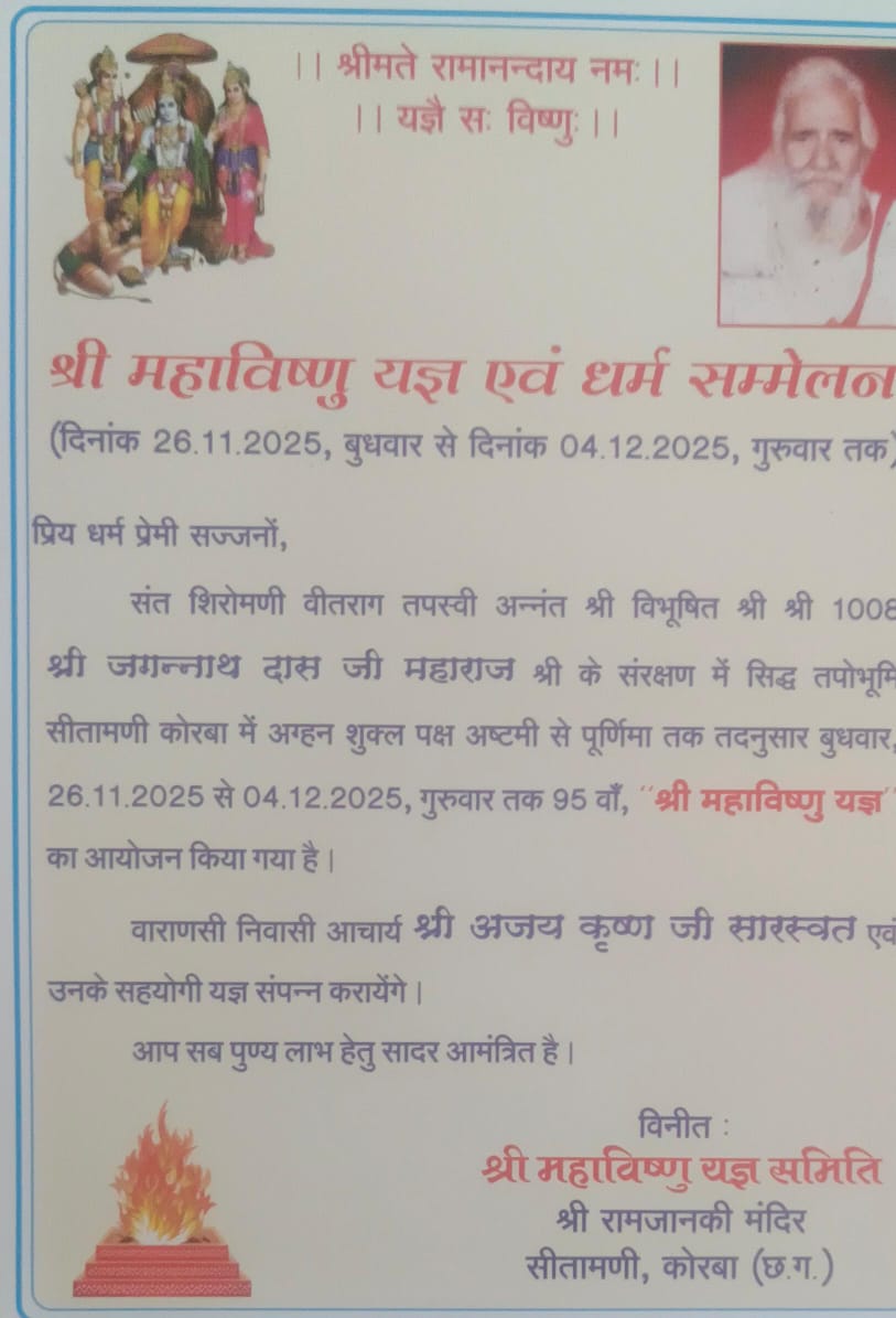 कोरबा। धार्मिक नगरी सीतामणी कोरबा में इस वर्ष भी श्री महाविष्णु यज्ञ एवं धर्म सम्मेलन का भव्य आयोजन किया जा रहा है। यह आयोजन अग्हन शुक्ल पक्ष अष्टमी से पूर्णिमा तक, यानी बुधवार 26 नवंबर 2025 से गुरुवार 4 दिसंबर 2025 तक संपन्न होगा।
