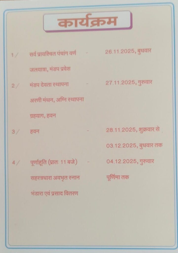 इस पावन यज्ञ का संचालन वाराणसी निवासी आचार्य श्री अजय कृष्ण जी सारस्वत अपने सहयोगी आचार्यों के साथ करेंगे। पूरे आयोजन के दौरान धार्मिक प्रवचन, संकीर्तन, भंडारा और सत्संग जैसे कार्यक्रमों का आयोजन होगा।