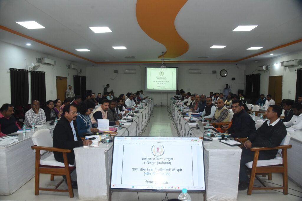अंबिकापुर 03 फरवरी 2026/  कलेक्टर  अजीत वसंत की अध्यक्षता में मंगलवार को जिला पंचायत सभाकक्ष में साप्ताहिक समय-सीमा की बैठक आयोजित की गई। बैठक में संचालित योजनाओं एवं कार्यक्रमों की विस्तृत समीक्षा कर कलेक्टर ने सम्बंधित अधिकारियों को आवश्यक दिशा-निर्देश दिए। बैठक में जिला पंचायत सीईओ विनय कुमार अग्रवाल, अपर कलेक्टर सुनील नायक,राम सिंह ठाकुर,अमृत लाल ध्रुव, नगर निगम आयुक्त  डी.एन. कश्यप सहित विभिन्न विभागों के अधिकारी उपस्थित रहे।