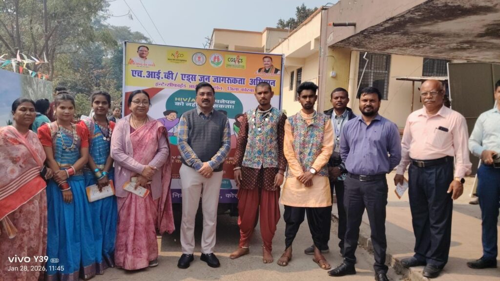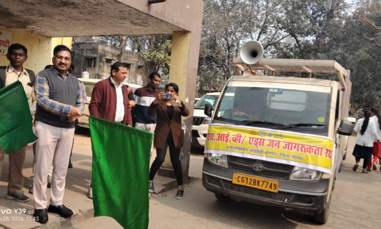 कोरबा 28 जनवरी 2026/कलेक्टर  कुणाल दुदावत के मार्गदर्शन में 28 जनवरी को इंटेंसिफाईड एचआईवी/एड्स जागरूकता कार्यक्रम के अंतर्गत सघन प्रचार प्रसार हेतु एड्स जागरूकता रथ तथा कला जत्था दल को मुख्य चिकित्सा एवं स्वास्थ्य अधिकारी के द्वारा हरी झंडी दिखा कर रवाना किया गया। इस अवसर पर डॉ.सी.के.सिंह, जिला स्वास्थ्य अधिकारी, डॉ. बी.आर.रात्रे नोडल अधिकारी एड्स, कुमार पुष्पेश, जिला टीकाकरण अधिकारी, पद्माकर शिन्दे, जिला कार्यक्रम प्रबंधक, कला जत्था के सदस्य तथा अन्य अधिकारी, कर्मचारी उपस्थित थे।