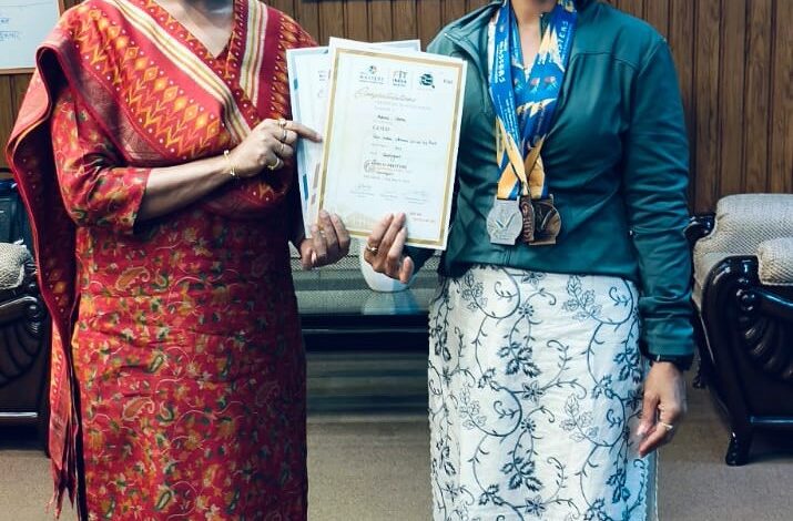बालोद, 27 मार्च 2026। चंडीगढ़ में आयोजित ‘खेलो मास्टर्स नेशनल गेम्स 2026’ में बालोद जिले की प्रतिभागी व्याख्याता अर्पणा वर्मा ने उत्कृष्ट प्रदर्शन करते हुए तीन पदक अपने नाम किए। बिना किसी विशेष अभ्यास के प्रतियोगिता में भाग लेकर उन्होंने अपनी प्रतिभा और दृढ़ संकल्प का शानदार परिचय दिया।