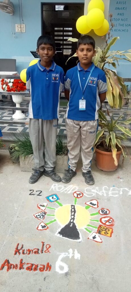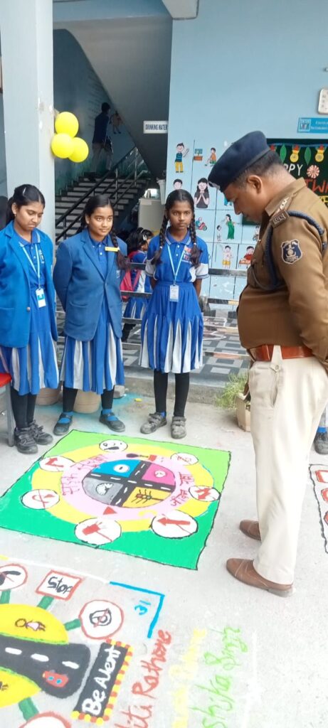 छात्र/छात्राओं ने सड़क सुरक्षा के थीम पर रंगोली के माध्यम से आकर्षक एवं रचनात्मक चित्र प्रस्तुत किए