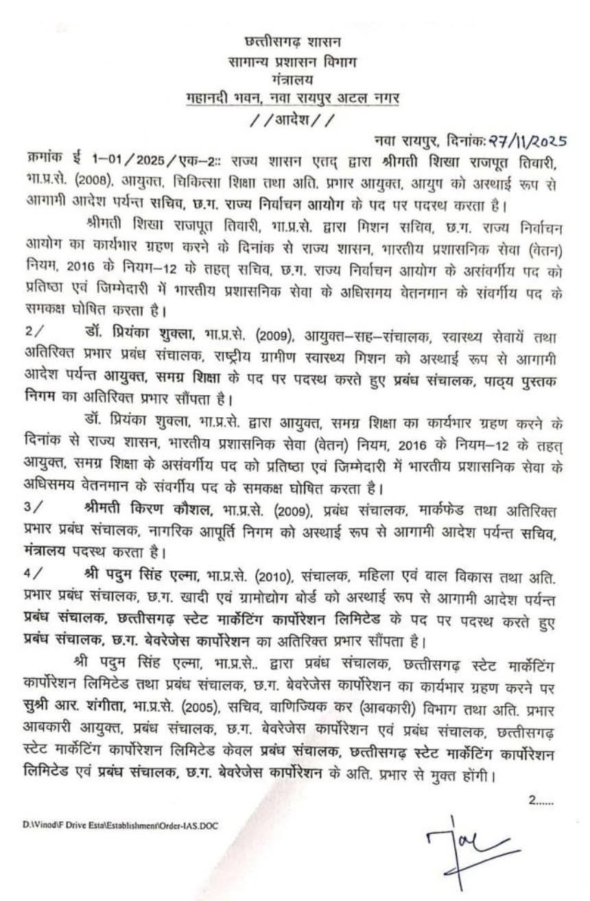 रायपुर।छत्तीसगढ़ शासन सामान्य विभाग ने किरण कौशल,संजीव कुमार झा सहित 13 IAS को नई जिम्मेदारी सौंपी हैं,देखें सूची…