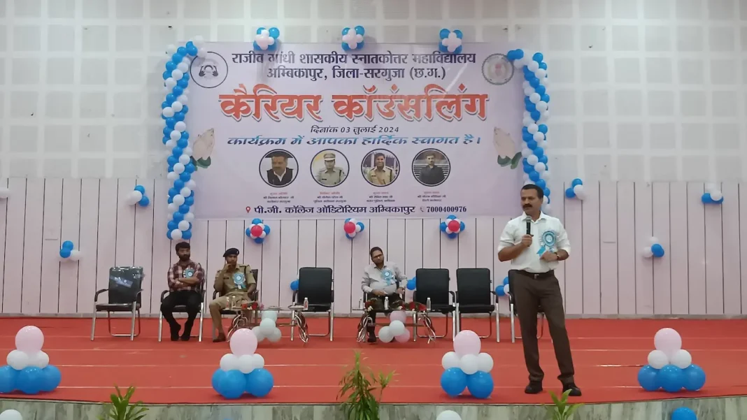 सरगुजा।राजीव गांधी शासकीय स्नातकोत्तर महाविद्यालय अम्बिकापुर द्वारा महाविद्यालय ऑडिटोरियम में बुधवार को युवाओं के लिए कैरियर काउंसलिंग कार्यक्रम का आयोजन किया गया। कार्यक्रम में मुख्य अतिथि के रूप में जिला कलेक्टर विलास भोसकर उपस्थित रहे। इस दौरान नगर के सीएसपी श्री रोहित शाह, डिप्टी कलेक्टर नीरज कौशिक, महाविद्यालय के प्राचार्य सहित प्रोफेसर, छात्र-छात्राएं एवं बड़ी संख्या में युवा उपस्थित रहे।कार्यक्रम की शुरुआत मां सरस्वती के छायाचित्र के समक्ष दीप प्रज्जवलित कर किया गया।