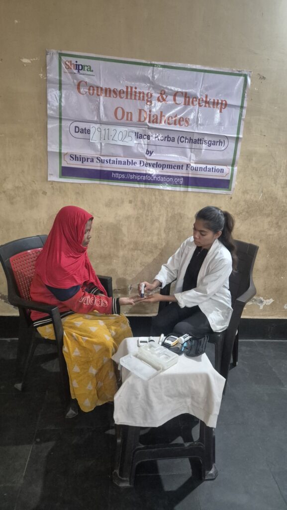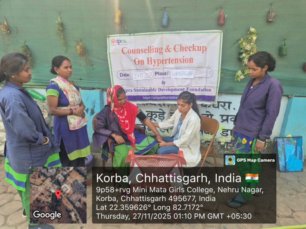 कोरबा। शिप्रा सस्टेनेबल डेवलपमेंट फाउंडेशन द्वारा नवंबर 2025 में कोरबा जिले में निवारक स्वास्थ्य सत्रों का आयोजन किया गया। इस हेल्थ कैंपेन के दौरान नि:शुल्क परामर्श और ब्लड प्रेशर (BP) जांच की सुविधा प्रदान की गई। साथ ही परिवार नियोजन एवं कल्याण पर मुफ्त परामर्श, HIV/AIDS से जुड़ी जानकारी एवं जागरूकता, तथा सड़क सुरक्षा संबंधी संदेश भी लोगों तक पहुँचाए गए। BP जागरूकता कार्यक्रम के अंतर्गत लोगों को उच्च रक्तचाप के बारे में जानकारी दी गई, BP की माप की गई तथा स्वास्थ्य कर्मियों द्वारा आहार संबंधी सुझाव भी प्रदान किए गए।