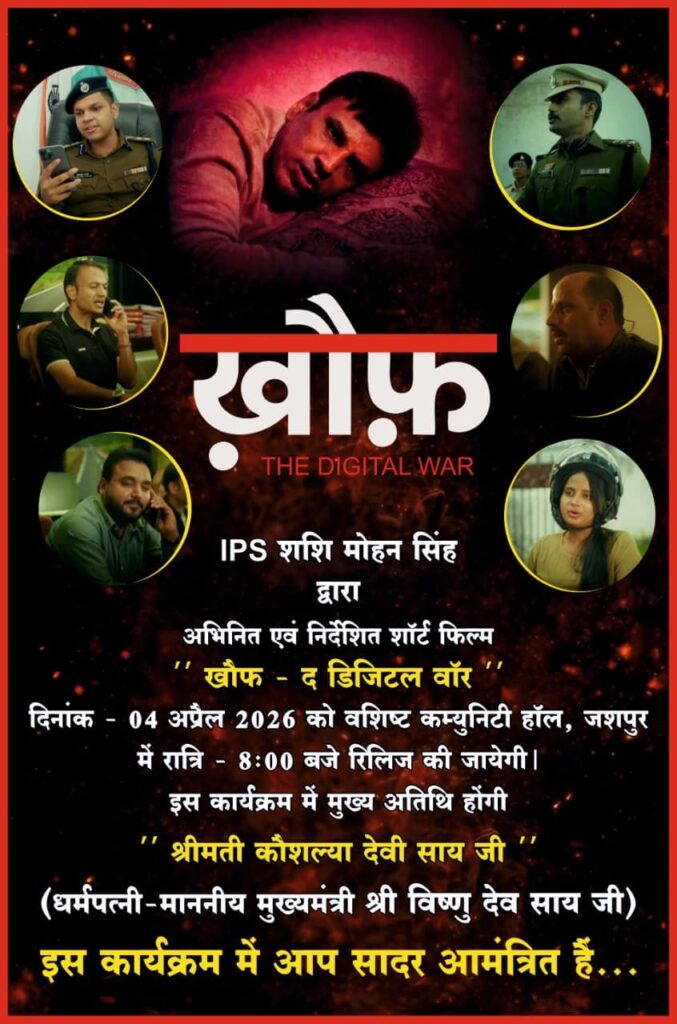 रायगढ़। एसएसपी रायगढ़ शशि मोहन सिंह द्वारा लिखित, निर्देशित और अभिनीत बहुप्रतीक्षित शॉर्ट फिल्म ख़ौफ़ – द डिजिटल वॉर का 4 अप्रैल यानी कि आज विशिष्ट कम्युनिटी हॉल, जशपुर में रात्रि 8:00 बजे विमोचन किया जाएगा। कार्यक्रम मुख्य अतिथि कौशल्या देवी साय, धर्मपत्नी मुख्यमंत्री विष्णु देव साय की गरिमामयी उपस्थिति में आयोजित किया जाएगा।