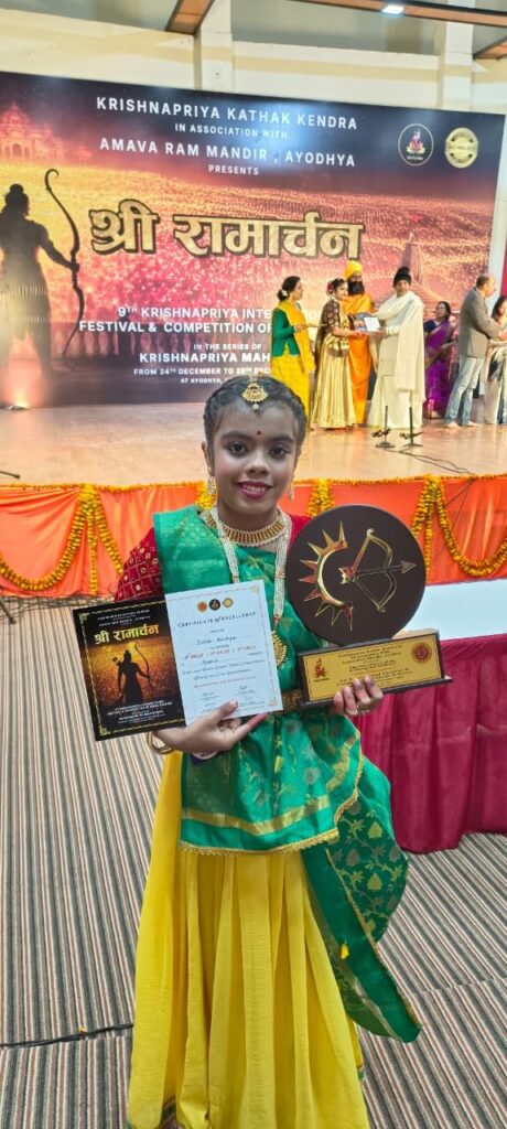 कोरबा। अभी हाल ही में इशिता ने राम जी की नगरी अयोध्या में चल रहे राष्ट्रीय नृत्य संगीत प्रतियोगिता में प्रथम स्थान प्राप्त कर कोरबा एवं छत्तीसगढ़ को गौरांवित किया है।