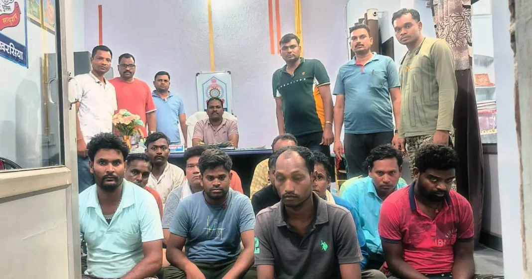 रायगढ़ 8 जून 2024। पुलिस अधीक्षक दिव्यांग कुमार पटेल के दिशा निर्देशन पर कल शाम एसडीओपी खरसिया प्रभात पटेल के नेतृत्व में चौकी खरसिया और चौकी जोबी की संयुक्त पुलिस टीम द्वारा आडपथरा माड नदी किनारे कुछ जुआरियों द्वारा 52 पत्ती तास से जुआ खेलने की मुखबीर सूचना पर घेराबंदी कर रेड किया गया । जुआ के दो फड पर पुलिस टीम ने 13 जुआरियान- (1) मोह. अनशार, पिता – मोह. मुख्तार, उम्र – 52 वर्ष,साकिन- तुरकापारा, थाना- सिटी कोतवाली, जिला – रायगढ़ (2) बृजलाल वर्मा, पिता – स्व. देवनारायण वर्मा, उम्र- 57 वर्ष, साकिन – कंकुबाई धरमशाला के पीछे,हमालपारा, चौकी- खरसिया (3) अमीत कुमार चौहान, पिता- दिलेश्वर चौहान,उम्र- 42 वर्ष ,साकिन – बसमुडा, थाना – खरसिया (4) पप्पु राजपुत, पिता – शौकी राजपुत, उम्र- 29 वर्ष,साकिन – अटलआवास खरसिया,चौकी – खरसिया (5) ओमकार उर्फ विक्की सिदार, पिता – राम सिदार, उम्र- 24 वर्ष,साकिन- अटल आवास खरसिया (6) मिनकेतन साहु ,पिता- मंगलू, उम्र- 26 वर्ष, साकिन – कशीचुँवा, थाना – भुपदेवपुर, जिला- रायगढ (7) केशव जायसवाल, पिता – महेत्तर जायसवाल,उम्र – 48 वर्ष, साकिन – खोखरोआमा, थाना – घरघोडा (8) छोटे लाल डनसेना, पिता- अक्तीराम,उम्र- 36 वर्ष, साकिन – जवलपुर, थाना- भुपदेवपुर (9) गेंदलाल डनसेना, पिता – बेदराम,उम्र – 32 वर्ष,साकिन – जवलपुर, थाना – भुपदेवपुर (10) भानु डनसेना, पिता- दिलचंद, उम्र- 31 वर्ष, साकिन- जवलपुर, थाना- भुपदेवपुर (11) नेतराम राठिया, पिता – चैतराम, उम्र – 34 वर्ष,साकिन – झिंटीपाली, थाना – भुपदेवपुर,जिला – रायगढ (12) रामेश्वर पटेल,पिता- अशोक पटेल,उम्र – 33 वर्ष, ग्राम- नवागव, थाना – खरसिया (13) देवनाथ उर्फ मंगलु डनसेना, पिता- पुनीराम, उम्र – 45 वर्ष, साकिन- बडे डुमरपाली, थाना- खरसिया को पकड़ा गया । जुआरियों के फड और पास से कुल 47,550 रूपये, तास पत्ती की गड्डी, प्लास्टिक का बोरी जप्त किया गया है । आरोपियों के कृत्य पर चौकी खरसिया (थाना खरसिया) में क्रमश: अप.क्र्. 367, 368/2024 धारा 3(2) छत्तीसगढ़ जुआ (प्रतिषेध) अधिनियम 2022 के तहत कार्रवाई किया गया है ।