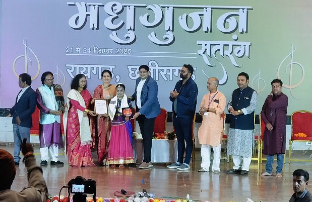 रायगढ़, 23 दिसम्बर विगत दिनों रायगढ़ के नगर निगम ऑडिटोरियम में आयोजित मधु गुंजन नृत्य एवं संगीत समारोह में नन्ही कथक नृत्यांगना इशिता कश्यप को नृत्य गुंजन अवार्ड से सम्मानित किया गया। यह भव्य आयोजन वैष्णव संगीत महाविद्यालय के तत्वावधान में 21 दिसंबर से 24 दिसंबर 2025 तक आयोजित किया जा रहा है।