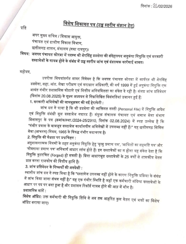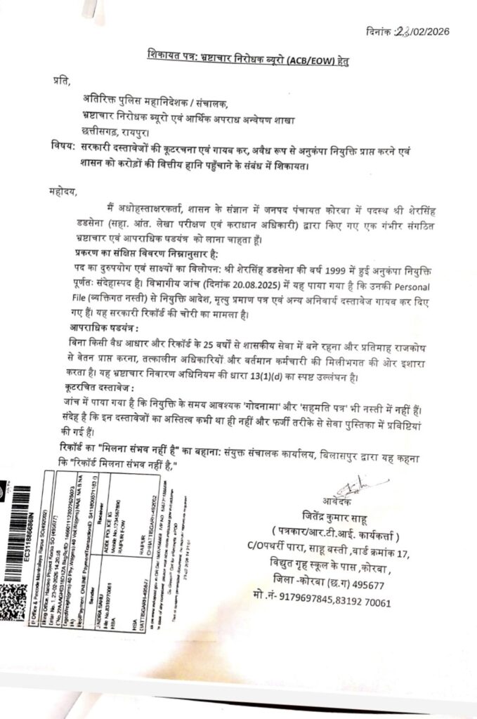 ​शिकायत के अनुसार, जनपद पंचायत कोरबा में पदस्थ सहायक आंतरिक लेखा परीक्षण एवं कराधान अधिकारी शेरसिंह डडसेना की नियुक्ति से जुड़े महत्वपूर्ण सरकारी दस्तावेज़ उनकी ‘पर्सनल फाइल’ का हैँ जो गायब हैं।