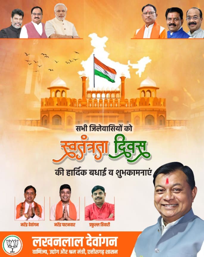विभाग मंत्री लखन लाल देवांगन 15 अगस्त को कोरबा के दौरे पर रहेंगे। प्रातः 08 बजे निवास स्थान चारपारा कोहड़िया से हाईस्कूल चारापारा कोहड़िया कोरबा के लिए प्रस्थान करेंगे। प्रातः 08ः05 बजे हाईस्कूल चारपारा कोहड़िया पहुंचेंगे व स्वतंत्रता दिवस के ध्वजारोहण कार्यक्रम में सम्मिलित होंगे। प्रातः 08ः55 बजे सीएसईबी फुटबॉल ग्राउण्ड पहुंचेंगे। प्रातः 09 बजे उक्त स्थान पर आयोजित स्वतंत्रता दिवस के जिला स्तरीय कार्यक्रम में ध्वजारोहण करेंगे एवं सांस्कृतिक कार्यक्रम में सम्मिलित होने के पश्चात् अपने निवास स्थान की ओर प्रस्थान करेंगे। शाम 04 बजे परशुराम भवन बुधवारी के लिए प्रस्थान करेंगे। शाम 04ः15 बजे उक्त स्थान पर ब्राम्हण समाज द्वारा आयोजित वृक्षारोपण कार्यक्रम एवं सम्मान समारोह में शामिल होंगे। शाम 05 बजे बुधवारी बाजार गणेश पंडाल के कबड्डी प्रतियोगिता में सम्मिलित होंगे। शाम 06 बजे हाउसिंग बोर्ड बाल्को पहुंचेंगे एवं श्रीमद् भागवत् ज्ञान यज्ञ सप्ताह में सम्मिलित होने के पश्चात् अपने निवास स्थान की ओर प्रस्थान करेंगे।
