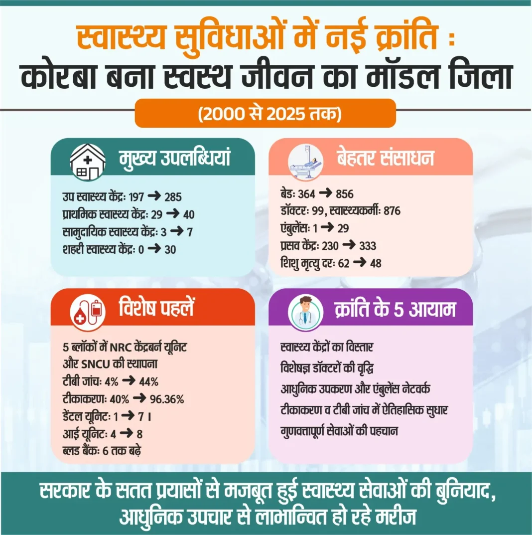 मुख्य चिकित्सा एवं स्वास्थ्य अधिकारी डॉ. एस.एन.केशरी ने जिले के स्वास्थ्य सेवाओं के संबंध में जानकारी देते हुए बताया कि वर्ष 2000 की तुलना में वर्ष 2025 तक कोरबा जिले की स्वास्थ्य सुविधाओं में उल्लेखनीय वृद्धि दर्ज की गई है- उप स्वास्थ्य केंद्र 197 से बढ़कर 285, प्राथमिक स्वास्थ्य केंद्र 29 से बढ़कर 40, सामुदायिक स्वास्थ्य केंद्र 3 से बढ़कर 7, शहरी स्वास्थ्य केंद्र 0 से बढ़कर 30, शहरी प्राथमिक स्वास्थ्य केंद्र 3 और शहरी सामुदायिक स्वास्थ्य केंद्र 1 है।