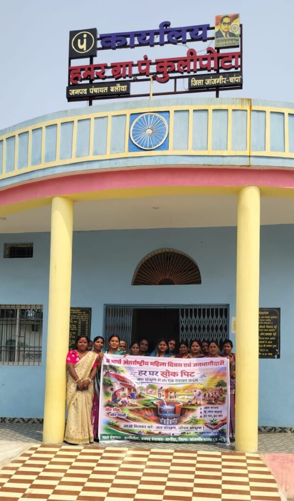 जांजगीर-चांपा, 08 मार्च 2026। कलेक्टर जन्मेजय महोबे के निर्देशन एवं जिला पंचायत सीईओ गोकुल रावटे के मार्गदर्शन में जिले में “मोर गांव – मोर पानी” अभियान के अंतर्गत जल संरक्षण को जन-आंदोलन बनाने की दिशा में विशेष पहल की जा रही है। विश्व महिला दिवस के अवसर पर जिलेभर के गांवों में जल संचय जनभागीदारी अभियान चलाया गया, जिसमें महिलाओं ने बढ़-चढ़कर भाग लेते हुए जल संरक्षण का संकल्प लिया। अभियान के तहत गांव-गांव में जनभागीदारी से सोक पिट निर्माण का कार्य किया जा रहा है। इसके साथ ही ग्रामीणों को रिचार्ज पिट, सोखता गड्ढा तथा रेन वॉटर हार्वेस्टिंग जैसी जल संरक्षण संरचनाओं के निर्माण के लिए प्रेरित किया गया, ताकि वर्षा जल का अधिक से अधिक संचयन कर भू-जल स्तर को बढ़ाया जा सके।