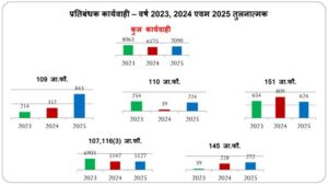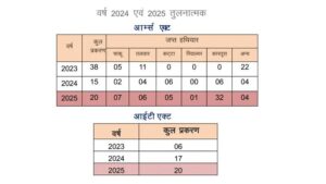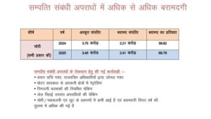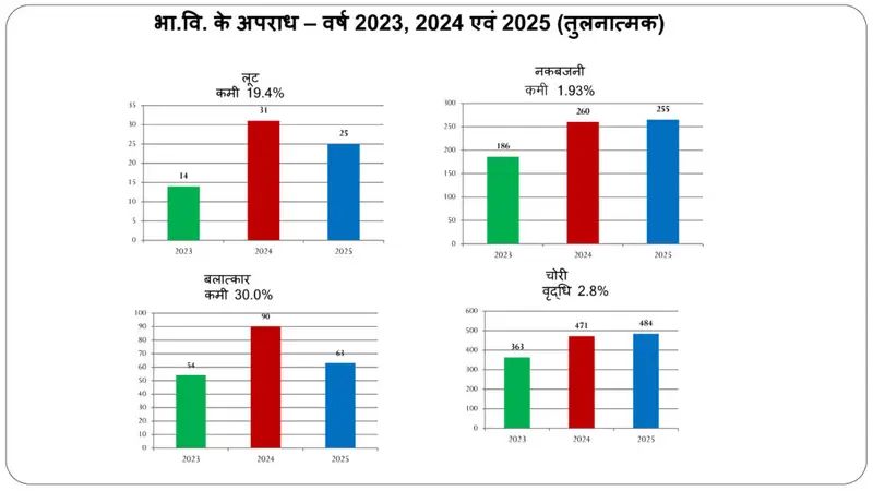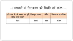 पुलिस रिकॉर्ड के अनुसार वर्ष 2025 में जिले में 7241 अपराध पंजीबद्ध हुए, जिनमें से 6372 मामलों का सफलता पूर्वक निराकरण किया गया। शेष मामलों में भी जांच प्रक्रिया प्रगतिशील अवस्था में है। तुलनात्मक रूप से देखें तो वर्ष 2023 और 2024 की अपेक्षा अपराधों के निराकरण की दर में निरंतर सुधार दर्ज किया गया है। आंकड़ों के अनुसार संपत्ति संबंधी अपराधों में भी पुलिस की कार्रवाई प्रभावी रही। चोरी, नकबजनी एवं लूट जैसे मामलों में आरोपियों की पहचान कर त्वरित गिरफ्तारी की गई। वर्ष 2025 में संपत्ति संबंधी अपराधों में निराकरण प्रतिशत में उल्लेखनीय बढ़ोतरी दर्ज की गई है।