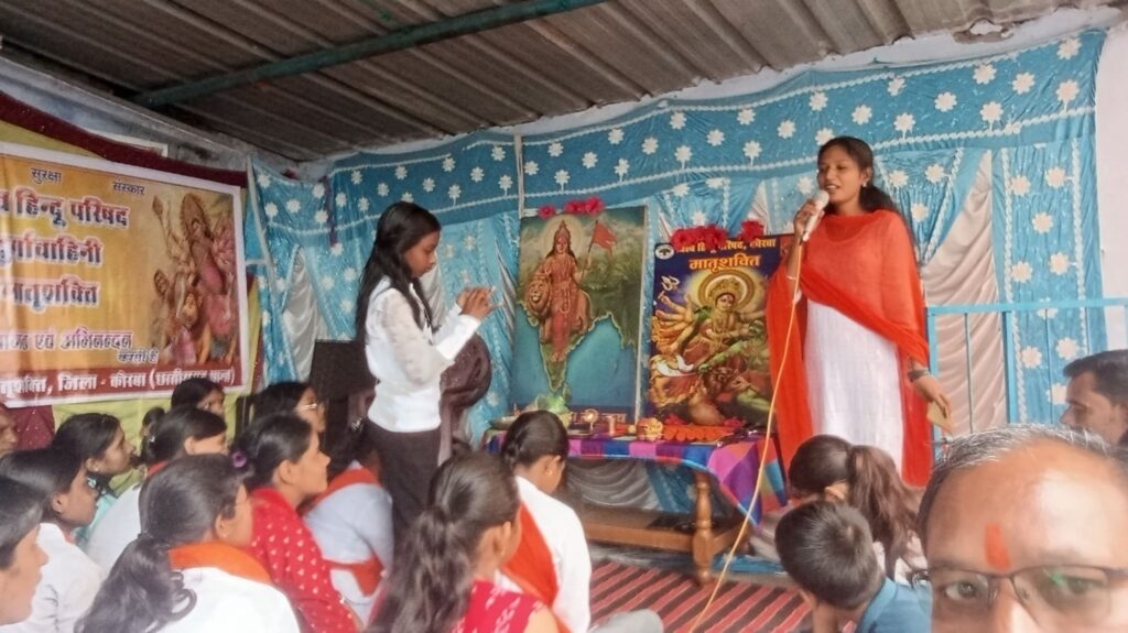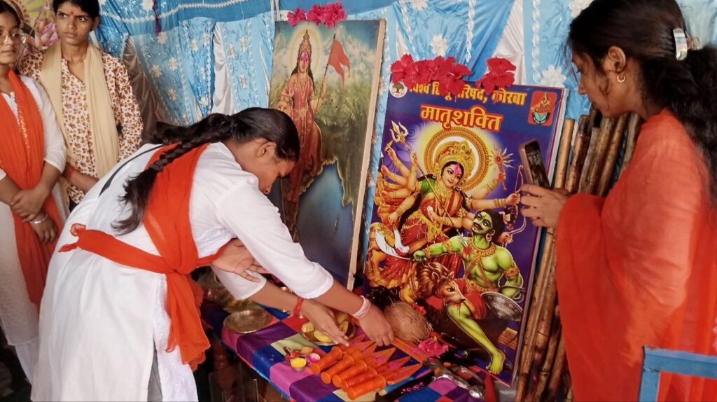 दुर्गा वाहिनी की बहनों ने अपने रक्त से दुर्गा माता को तिलक लगाया और राष्ट्र और समाज के लिए अपने प्रतिबद्धता को दोहराया है। आज के इस कार्यक्रम में दुर्गा वाहिनी के पूर्णिमा चौहान पूर्व जिला शक्ति साधना प्रमुख अनु यादव, प्रखंड संयोजिका चांदनी साहू, सृष्टि धुर्वे, रुचि धुर्वे, आरती विश्वकर्मा, अन्नू गुप्ता, ख्याति राज गुप्ता, तनु मानिकपुरी, स्वामी झा, पीहू ठाकुर, वर्षा ठाकुर, डिंपल गुप्ता, रागिनी गुप्ता, पीहू, गीत महंत ने सक्रिय भागीदारी निभाया।