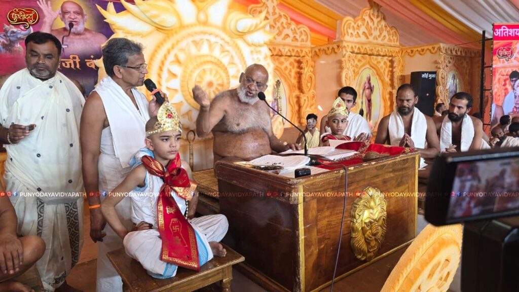 मुनिश्री ने आगे कहा कि जब बच्चा 8 वर्ष का हो जाए, तो उसे नया वस्त्र पहनाकर, रिश्तेदारों के साथ, चंवर ढोरते हुए मंदिर ले जाना चाहिए। बच्चे के हाथ में अष्टद्रव्य की थाली हो, वह भगवान की वंदना करे, अभिषेक करे, और फिर घर के बुजुर्ग उससे कहें–