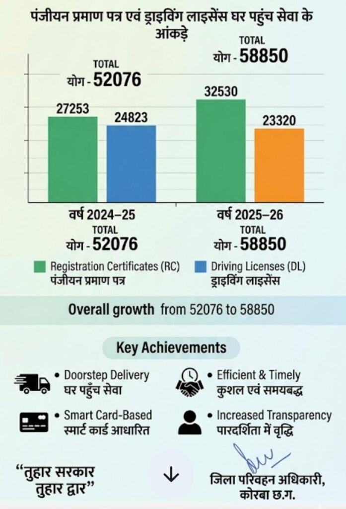 कोरबा 25 मार्च 2026/छत्तीसगढ़ शासन की “तुंहर सरकार तुंहर द्वार“ योजना के अंतर्गत परिवहन विभाग द्वारा दी जा रही घर पहुँच सेवाओं ने नागरिकों के जीवन को सुगम और सरल बना दिया है। प्रदेश सरकार की इस मंशा को आगे बढ़ाते हुए परिवहन विभाग द्वारा कुशल और समयबद्ध तरीके से स्मार्ट कार्ड आधारित ड्राइविंग लाइसेंस और वाहन पंजीकरण प्रमाणपत्र (आरसी) सीधे आवेदकों के घर के पते पर पहुँचाए जा रहे हैं। इस पहल का मुख्य उद्देश्य नागरिकों को सरकारी दफ्तरों के चक्कर काटने से मुक्ति दिलाना और पारदर्शी व्यवस्था सुनिश्चित करना है।